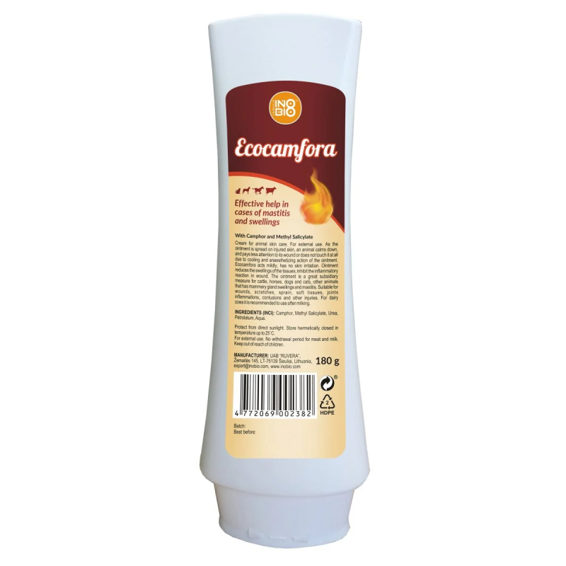 Numai pentru uz extern. O dată ce unguentul este aplicat pe pielea afectată, animalul se calmează și acordă mai puțină atenție ranei sau nu o mai atinge, datorită acțiunii răcoritoare și anestezice a unguentului. Ecocamfora acționează delicat, nu irită pielea.